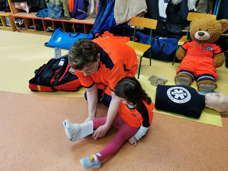 Dzieci dowiedziały się  jakim sprzętem dysponują ratownicy,  do czego służy oraz  jakiej  ratownicy udzielają pomocy.
